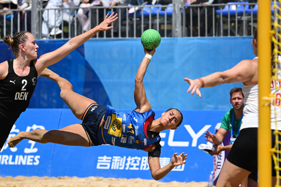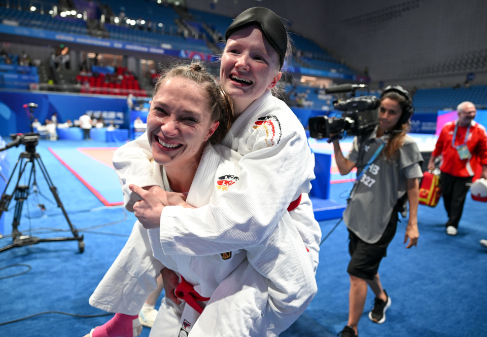 8月12日,德国组合胡内克/帕什凯维奇(左)在比赛后庆祝胜利。新华社记者 冯开华 摄