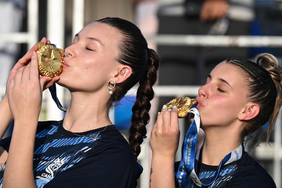 8月12日,冠军阿根廷队球员在颁奖仪式上亲吻金牌。新华社记者 陈振海 摄