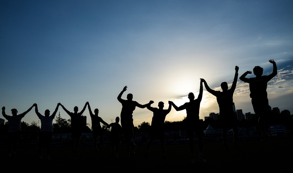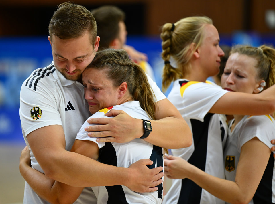8月12日,德国队在赛后相拥。新华社记者 姜克红 摄