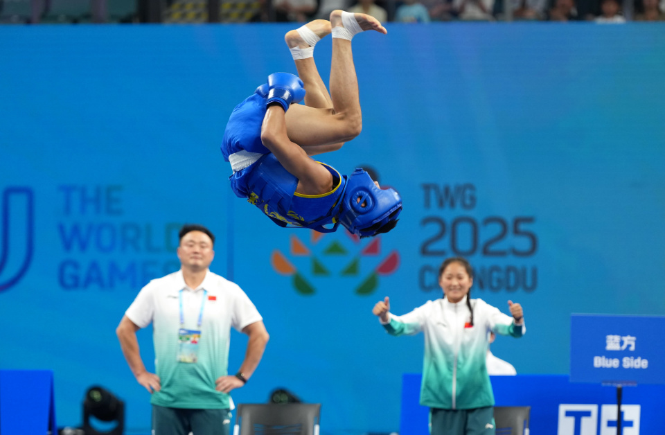 当日,在2025年成都世运会武术男子散打56公斤金牌赛中,中国选手唐思硕战胜越南选手杜辉煌(音),夺得冠军。8月12日,中国选手唐思硕(上)庆祝夺冠。新华社记者 徐速绘 摄